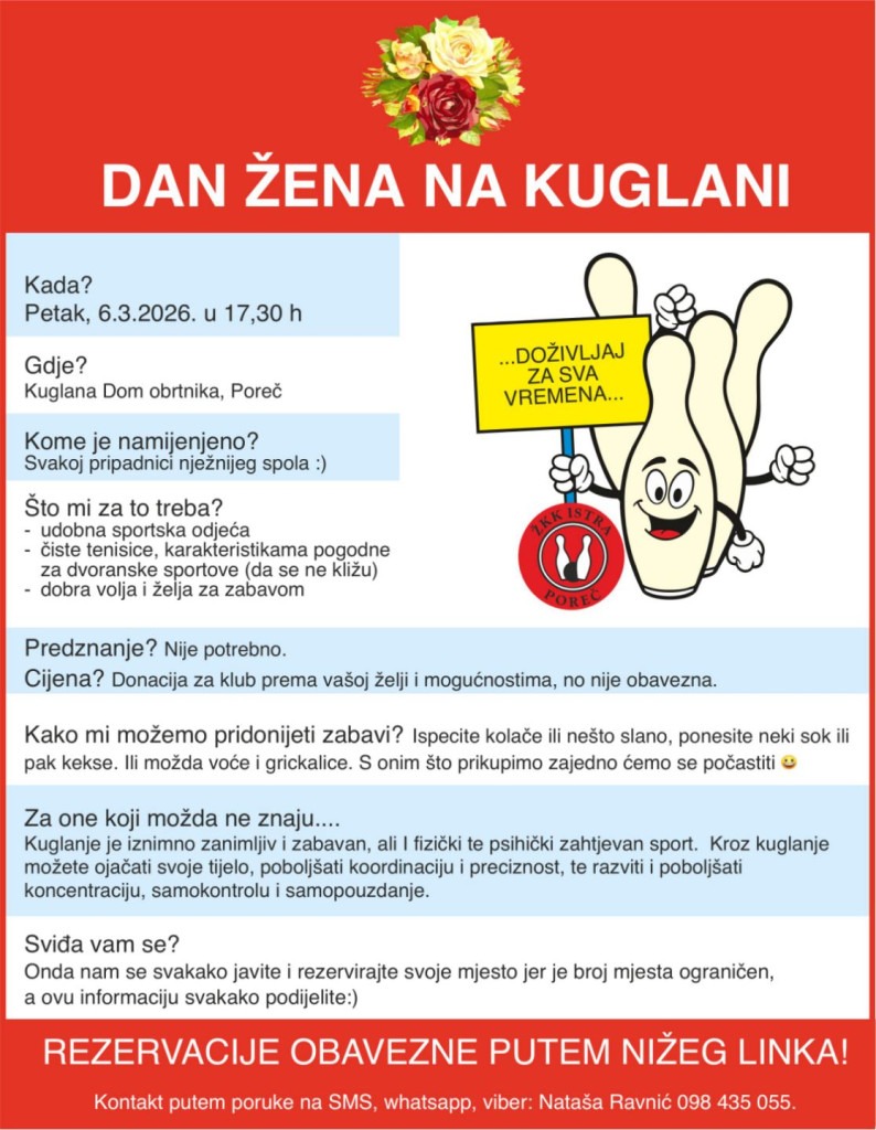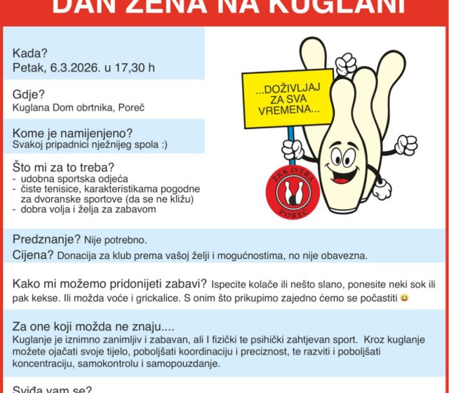 U petak, 6. ožujka 2026. u 17:30 sati u Kuglani Dom obrtnika u Poreču održat će se rekreativni kuglački turnir „Dan žena na kuglani“.